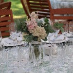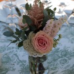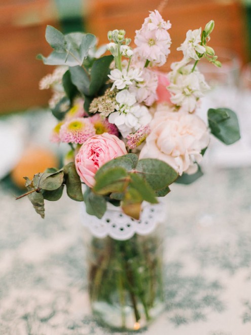 Rosas, alhelí, astilbe, eucalipto, flor de arroz… flores en tonos rosas, blanco y nude para los centros de mesa de la boda de Gema y Luis.
