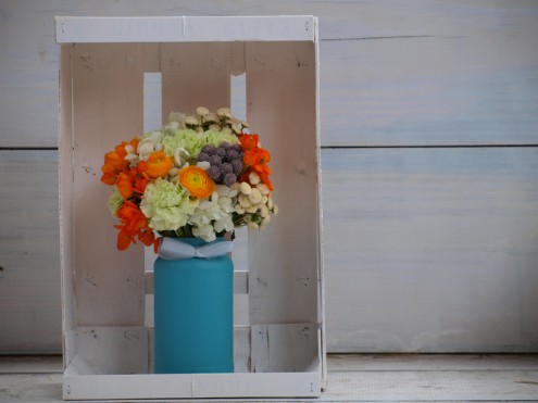 Un bouquet de tonos vibrantes que dan vida a cualquier rincón. Y es que el naranja es un color enérgico y alegre. En cuanto a las flores, hay una gran variedad: claveles, ranúnculos, dragonaria, matricaria, ornitogalum y verde africano (teñido de gris porque en realidad es rojo)