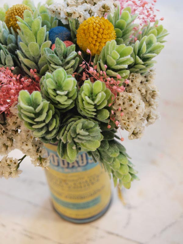Me encantan estos botes antiguos de medicamentos como recipientes para mis flores. Algunos están desgastados por el tiempo, pero no importa. Mejor aún porque es mayor el contraste con la delicadeza de las flores. Precio: 15 y 20 euros por unidad.