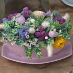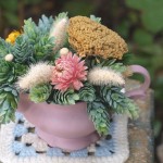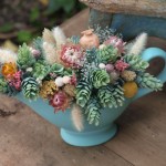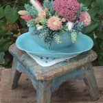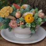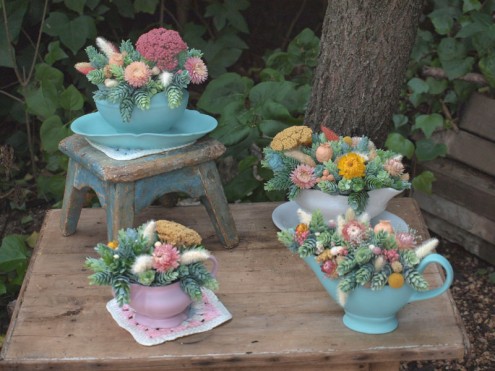 Son soperas antiguas con flores secas y artificiales. Las de colores las he pintado para darles un toque más actual.
