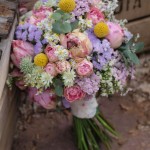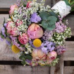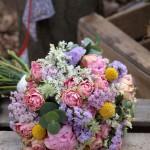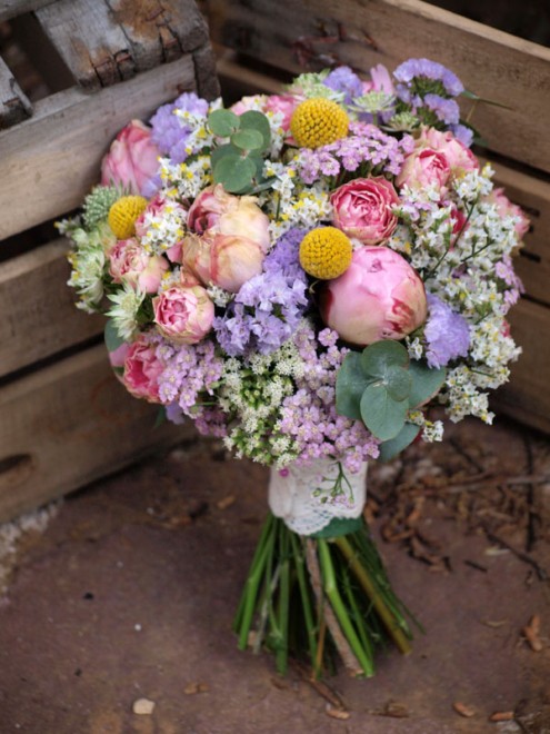 Un bouquet de aspecto silvestre para Ana. Rosas de pitiminí, siemprevivas, limonium, peonías… son algunas de las flores. El encaje que envuelve el tallo es de su abuela.