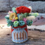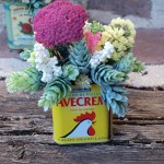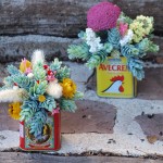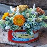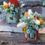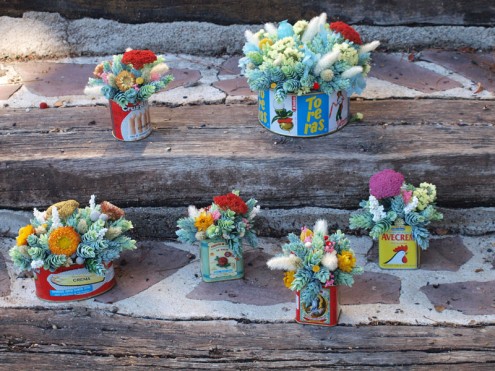 Flores en latas de sardinas, de espárragos, de pimentón… latas de productos españoles para decorar las mesas de La taberna La Imperial en la calle Ayala.