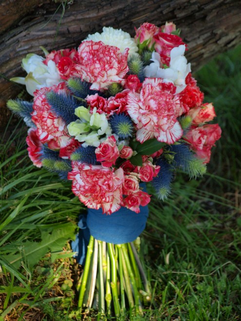 Me encantan los eringium. Creo que si sois seguidores de mi trabajo lo habréis notado porque lo utilizo en muchos de mis ramos. Son los cardos de un azul índigo maravilloso. Esta vez lo combino con el rojo de claveles y minirosas y toques de blanco de alhelíes.