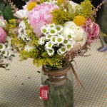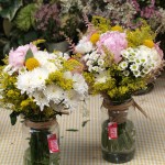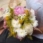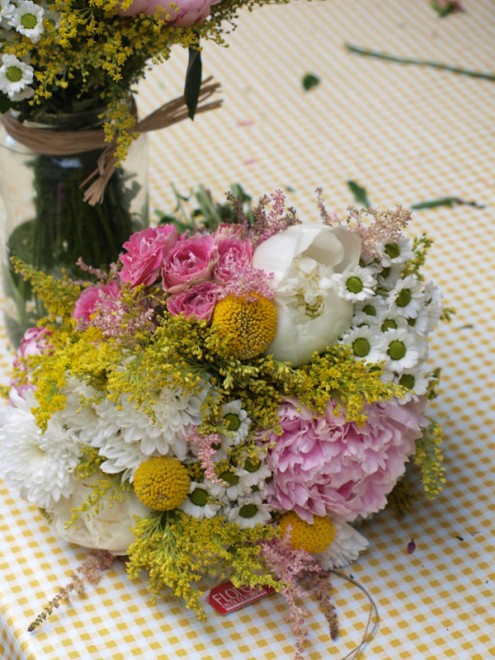 Sandra quería para su ramo de novia peonías, margaritas, astilbe y craspedias. El solidago amarillo se lo propuse yo para dar un toque silvestre. La combinación amarillo, rosa y blanco es de lo más romántica, ¿no os parece? A sus amigas les regaló una réplica del ramo.