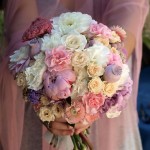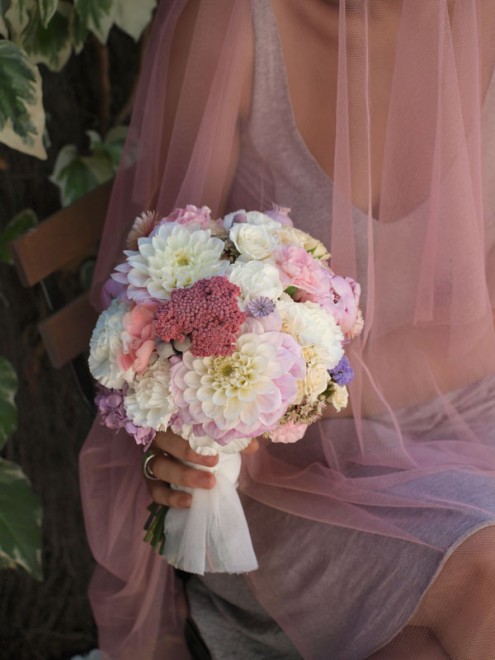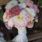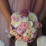 Últimamente las novias me piden mucho este tipo de ramo en tonos pastel. Son parecidos pero nunca iguales. Este lleva peonías, dalias, rosas, brunia, claveles…