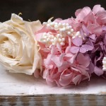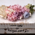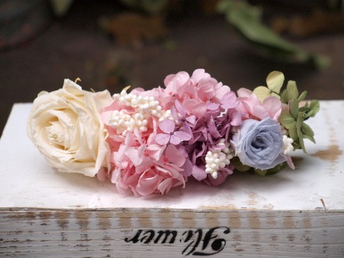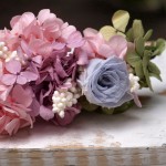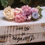A juego con su ramo de novia, Diana llevó este pequeño tocado floral de hortensias y rosas preservadas que se lo puso sujetando el pelo por detrás.