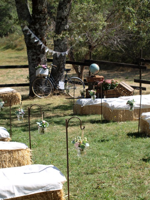 Si me casara, haría una boda como la de Gema. Sería en un sitio perdido, en plena naturaleza, como la finca Prados Riveros, en Rascafría (preciosa), con balas de paja, cajas, maletas, bicicleta y un photocall estilo picnic… todo era idílico en esta boda.
