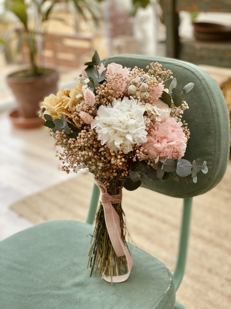 El pasado sábado se casó Rebeca con este ramo de flores preservadas con base de eucalipto. En el ramo predomina el color blanco para que contrastara bien con un vestido de «no novia» en tonos verdes y estampado de flores en la parte de arriba. Un look muy acorde con el estilo de boda informal que buscaban los novios.