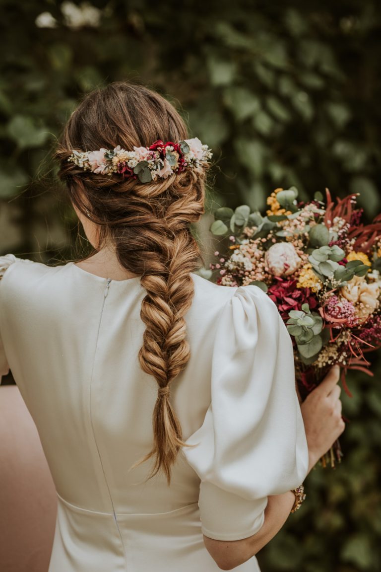 Este verano se casó Julia en Prados Riveros, una de mis fincas preferidas, con un bonito vestido de Yoland Chris estilo boho. A juego con el ramo, le hicimos una corona con base de eucalipto, ambos de flores preservadas.