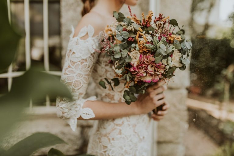 Bea quería un ramo de novia discreto, que no quitara protagonismo al vestido así que optamos por flores de color blanco roto y el verde grisáceo de la cineraria. Eso si, me permiti la licencia de meter una pequeña nota de color con el ranúnculo rosa.