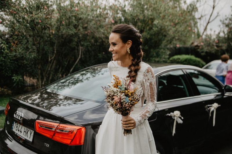 Cristina eligió un romántico vestido de Juan Brea con falda de muselina y cuerpo de guipur. En definitiva una novia con un look muy boho para el que este tipo de ramos silvestres van fenomenal.