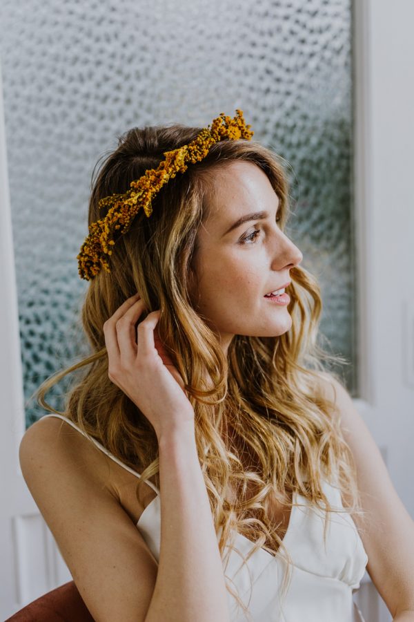 80,00€1 reviewCon esta corona nos la jugamos todo al amarillo, mostaza porque sólo tiene una única flor, el solidago, y un único color. Está pensado para novias informales, para una boda silvestre, en el campo, con un vestido boho.
