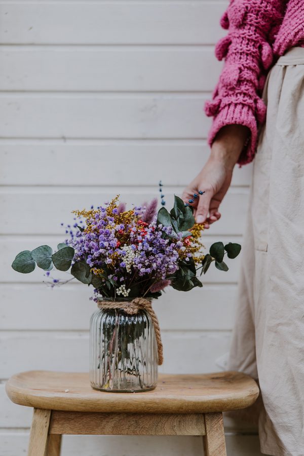 - Todas las flores son preservadas, incluido el eucalipto. Lleva una hortensia color buganvilla y flores silvestres.