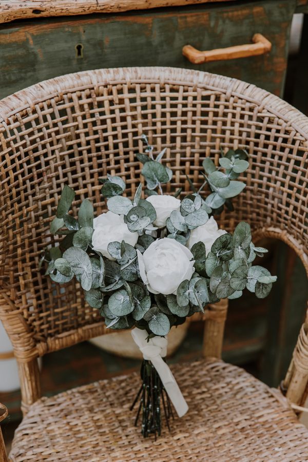 - Este ramo está compuesto de cinco peonías blancas y eucalipto cinerea.