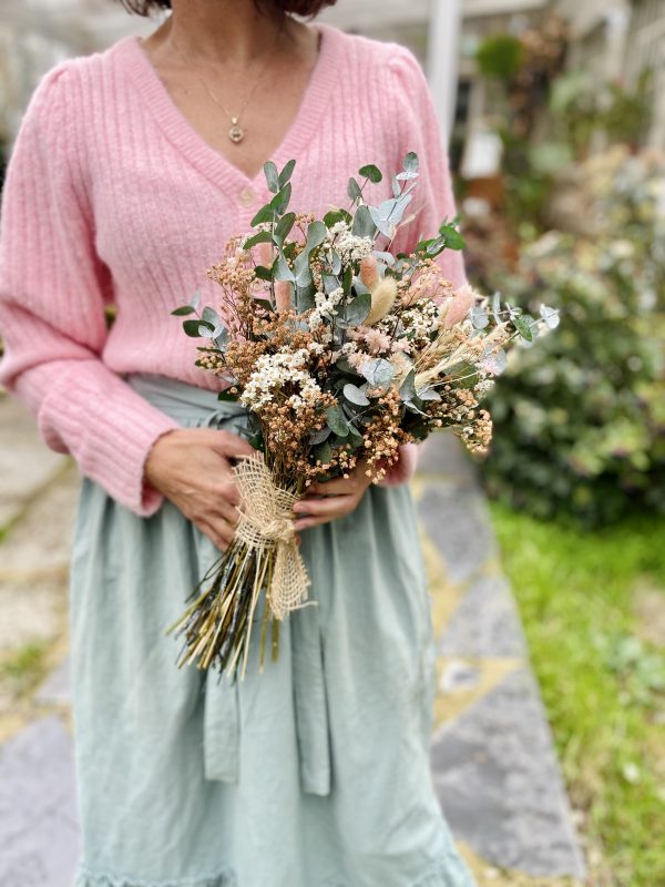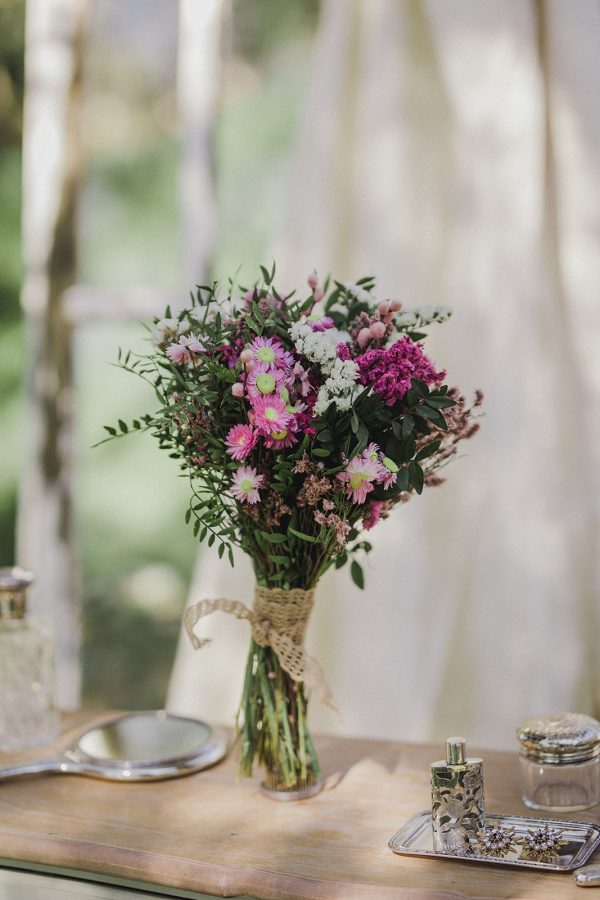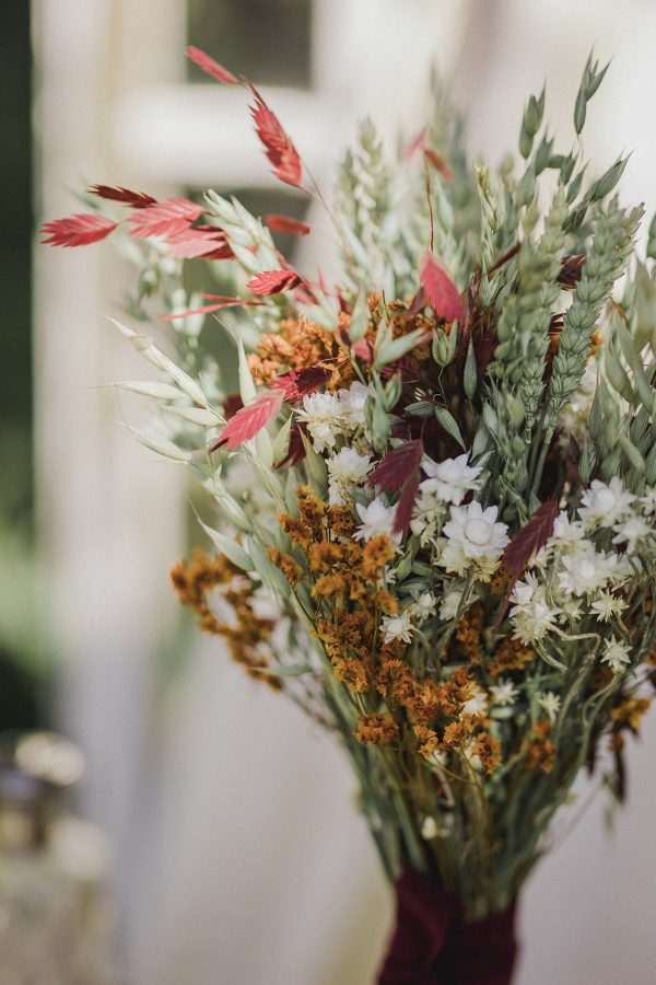 - ¿Cómo se consigue ese aspecto campestre? Pues con las flores silvestres pequeñitas de las que está compuesto el ramo. Flores tipo paniculata, solidago, flor de arroz, trigo, avena…