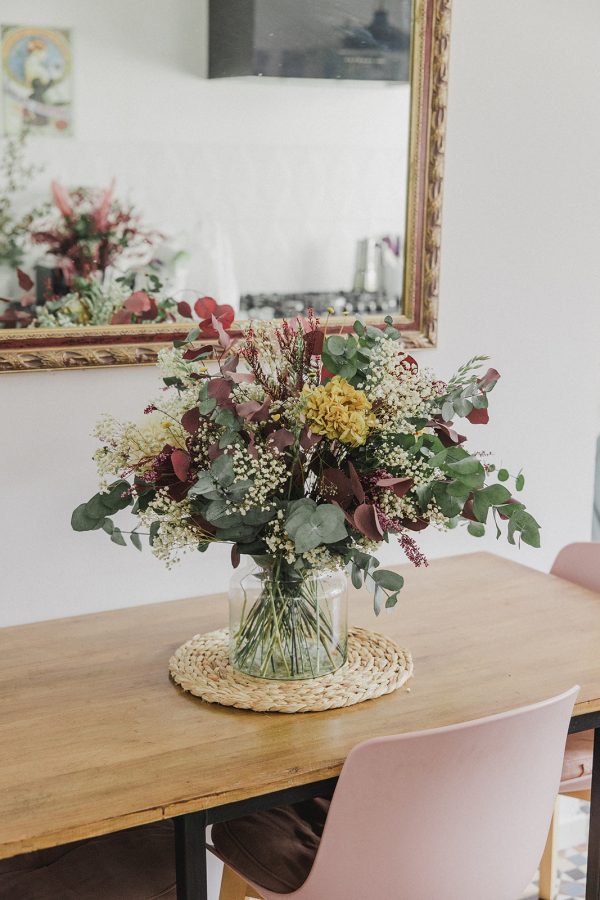 - Este centro quedará bien en una mesa de comedor o en un recibidor grande. Está confeccionado en esponja floral húmeda para que dure un poquito más. La variedad de flores que lo componen quedan igualmente bonitas según se van secando.