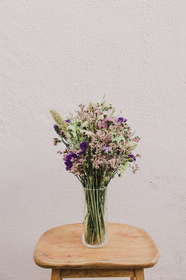 A estas flores tan coloridas se les conoce con el nombre de statice o siemprevivas porque se pueden secar y durar toda la vida o al menos mucho tiempo. En esta ocasión, estas siemprevivas no son secas, son preservadas, es decir durarán todavía más tiempo sin que se caigan.- Además de siemprevivas lleva limonium seco y avena.