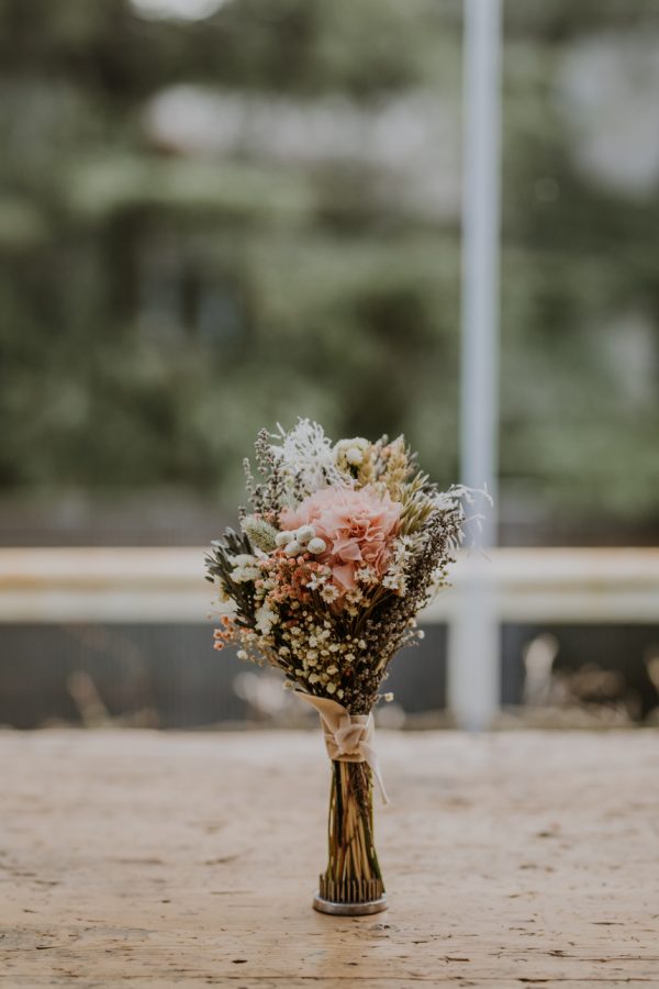 - ¿Cómo se consigue ese aspecto campestre? Pues con las flores silvestres pequeñitas de las que está compuesto el ramo. Flores tipo paniculata, solidago, flor de arroz, trigo, avena…