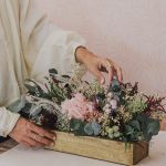 Este centro de flores preservadas lleva una base de eucalipto y está realizado en una caja de madera hecha y pintada a mano en nuestro taller, totalmente artesanal. Por este motivo tu caja siempre será única, no habrá otra igual.