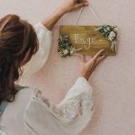 Este cartel de madera tiene dos detalles de flores preservadas.