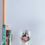 Cúpula de cristal con centrito blanco de flores preservadas.