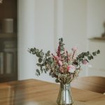 Recipiente de cristal ligeramente verdoso incluido en el centro, junto con las flores preservadas.