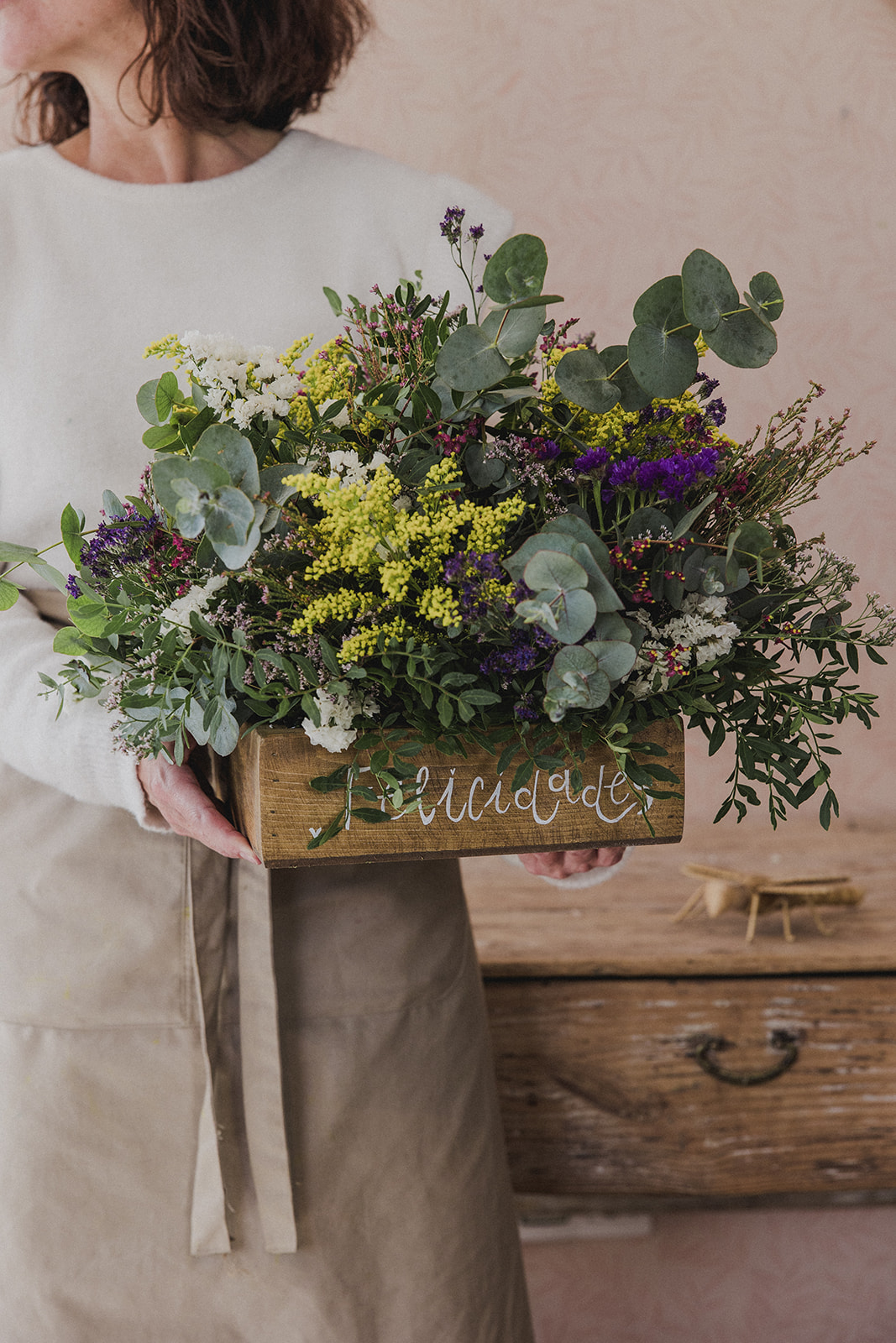 Medidas aproximadas del centro con flores: 36 cm de alto (la rama más alta) x 25 cm de ancho x 40 cm de largo.