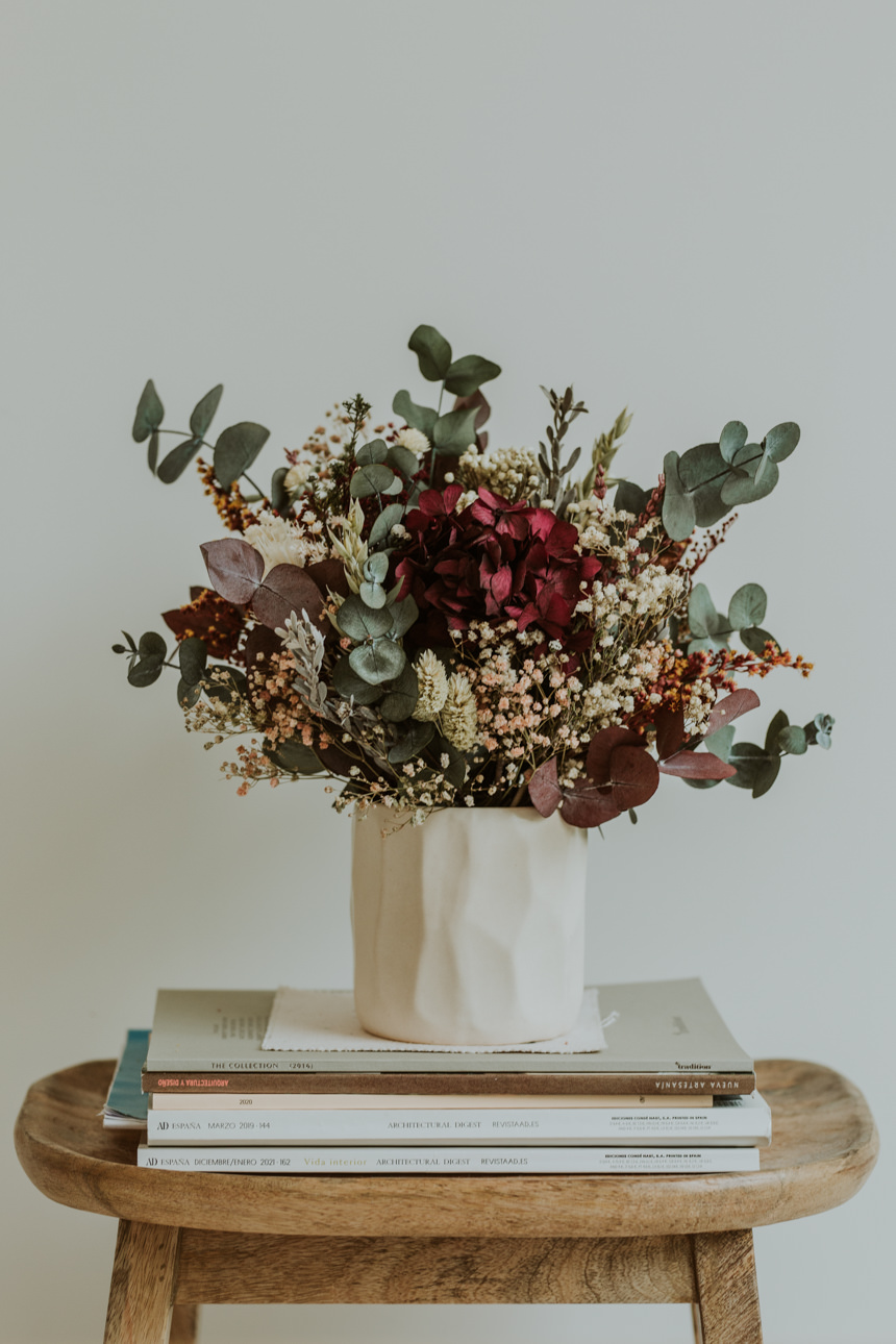 Es un centro mediano, perfecto para una mesita de café, una mesilla de noche o una mesa de comedor pequeña. Los tonos rojizos y granates aportan calidez a cualquier habitación. Eso sí, destacarán todavía más combinados con una decoración neutra.