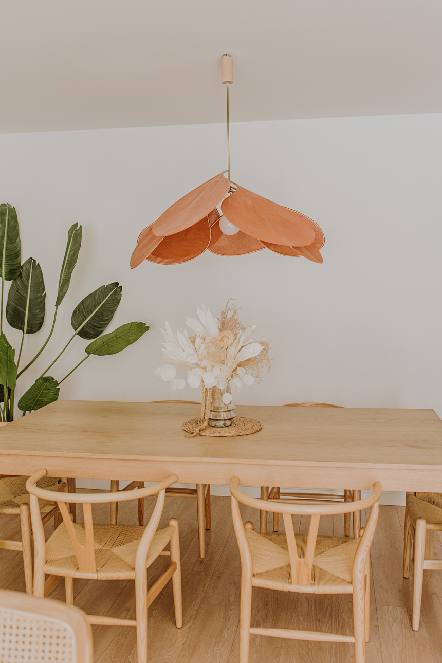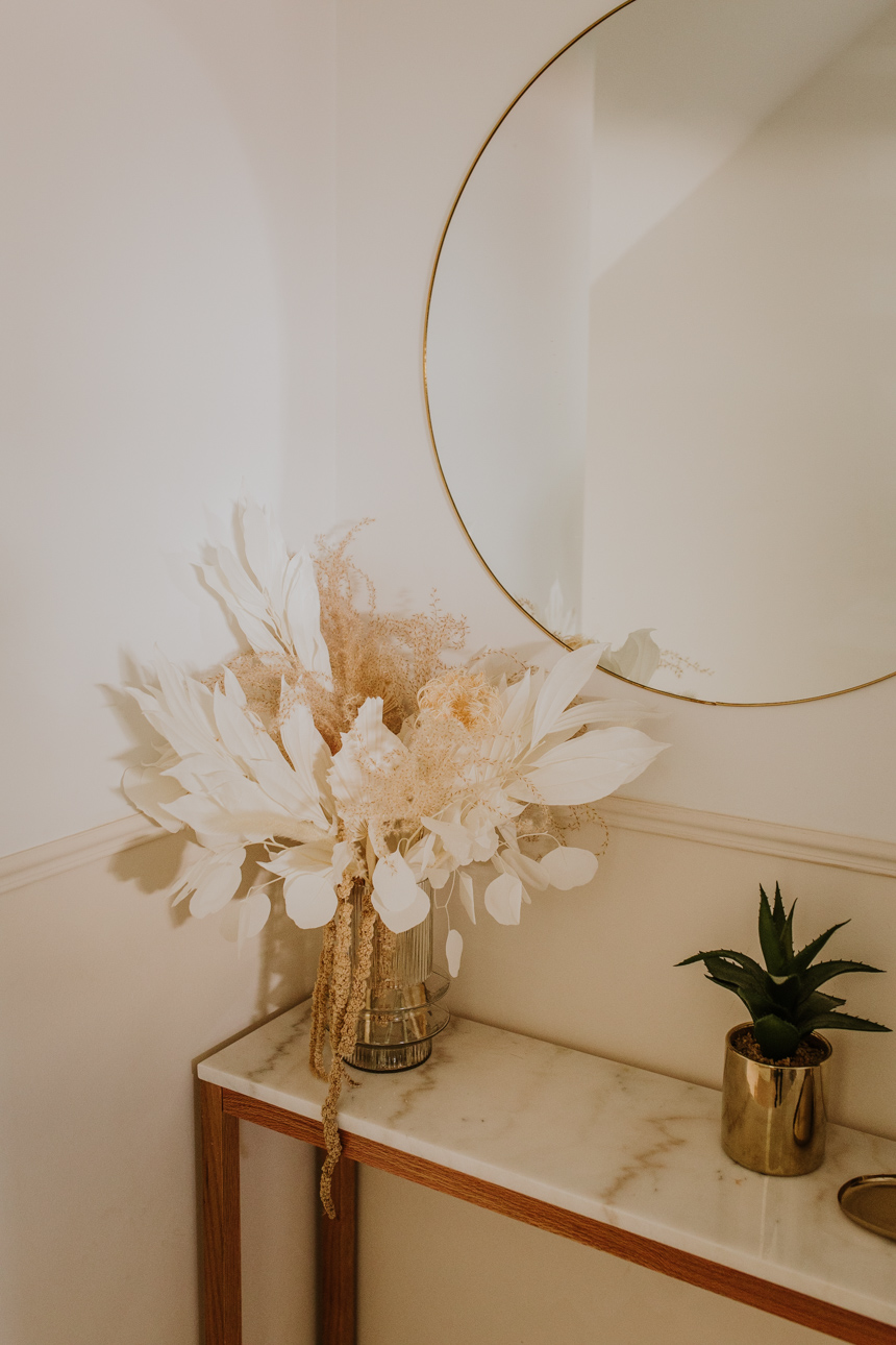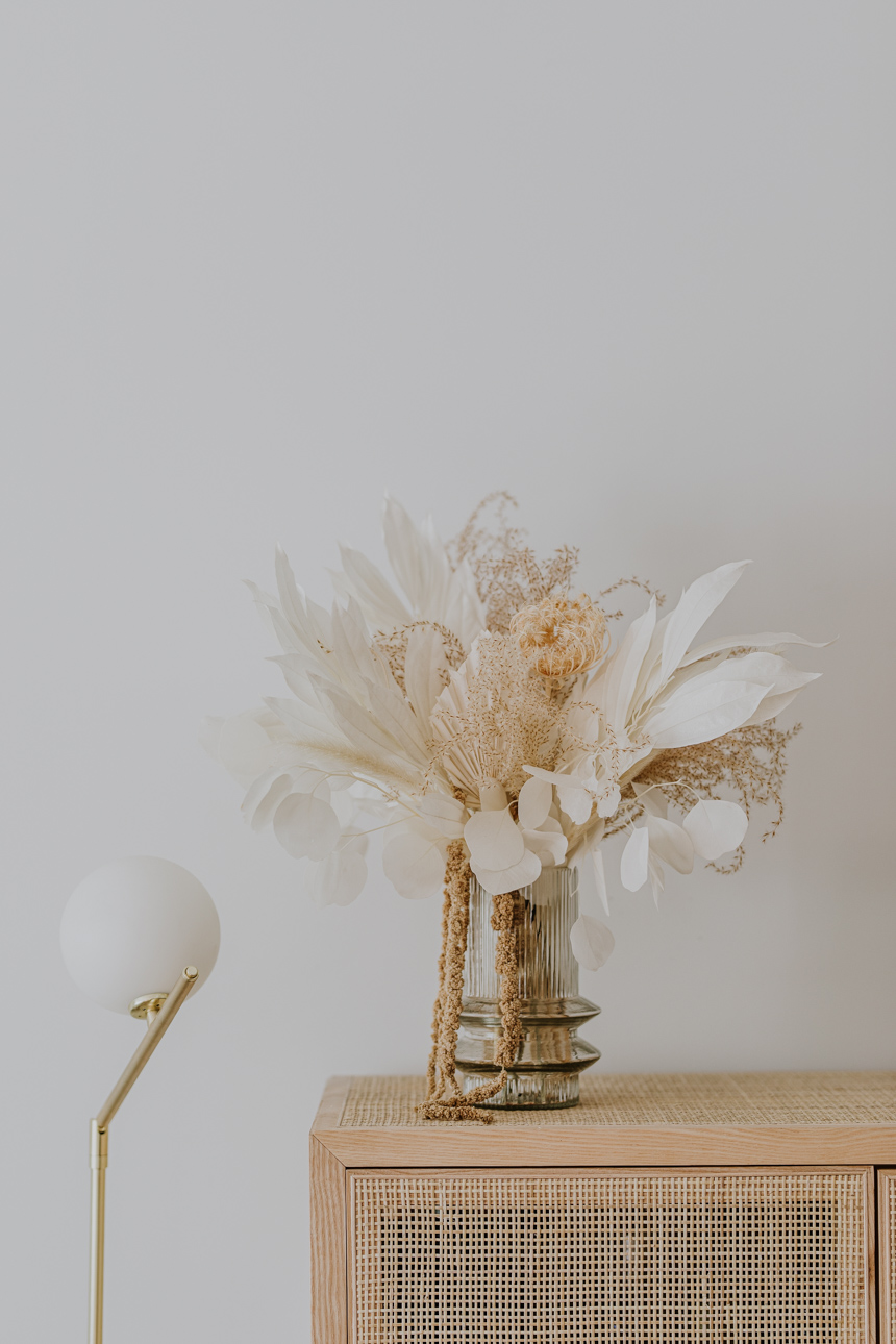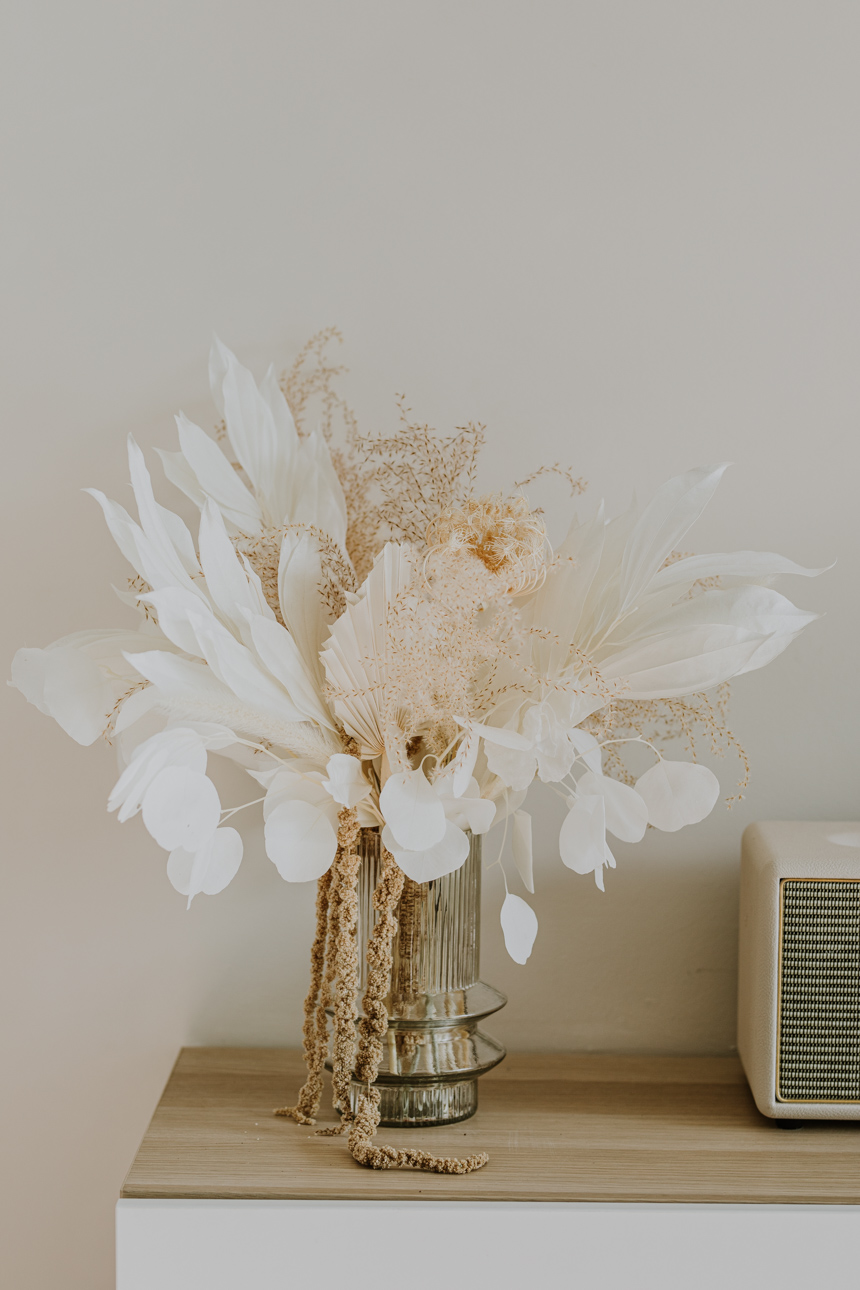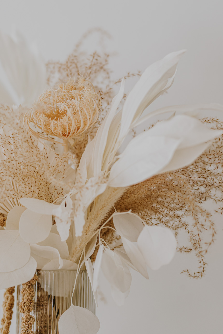 Recipiente de cristal incluido en el centro, junto con las flores preservadas.