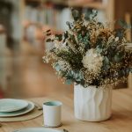 Recipiente de cerámica incluido en el centro, junto con las flores preservadas.