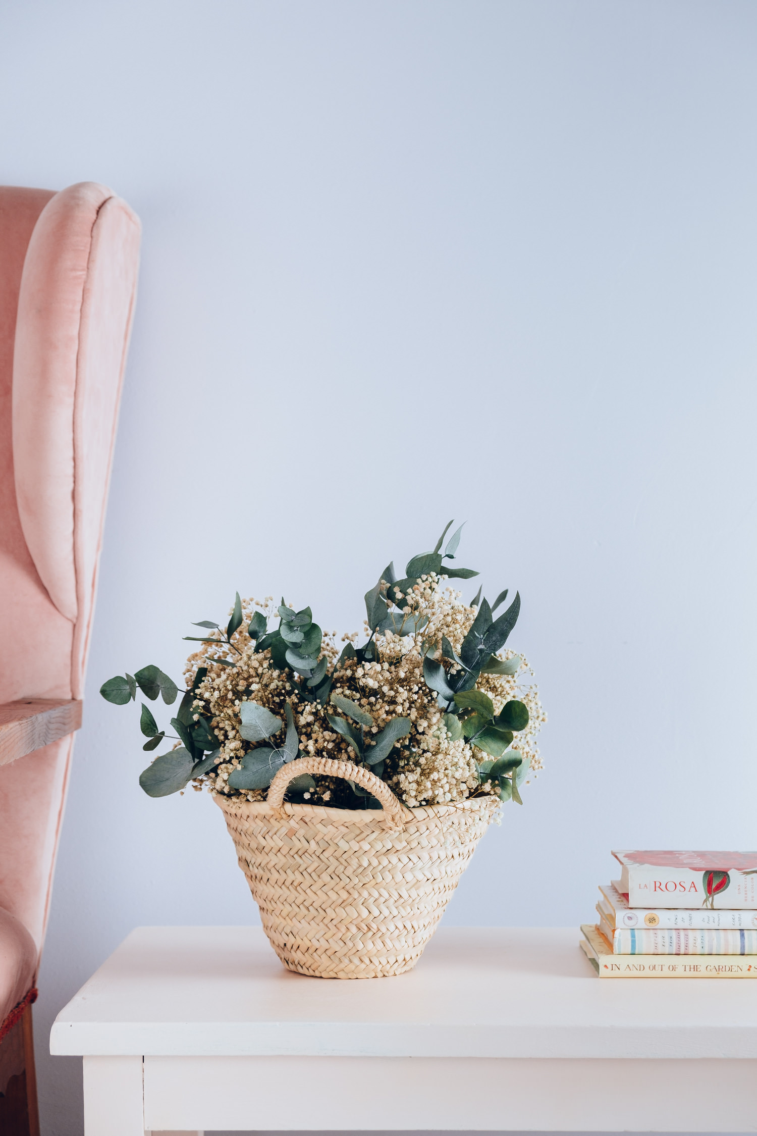 Este cestito sólo lleva dos variedades de flor, paniculata en rosa o blanco y eucalipto.