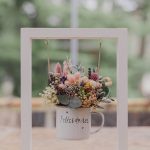 Este columpio está compuesto por una taza de latón con flores naturales preservadas que cuelga de una cuerda.
