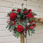 Corona de flores preservadas con diferentes tipos de verde y flores silvestres en tonos rojizos, ocres, mostaza y blanco.