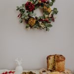 Corona de flores preservadas con eucalipto, hortensias ocre y rojizas, y variedad de flores silvestres.