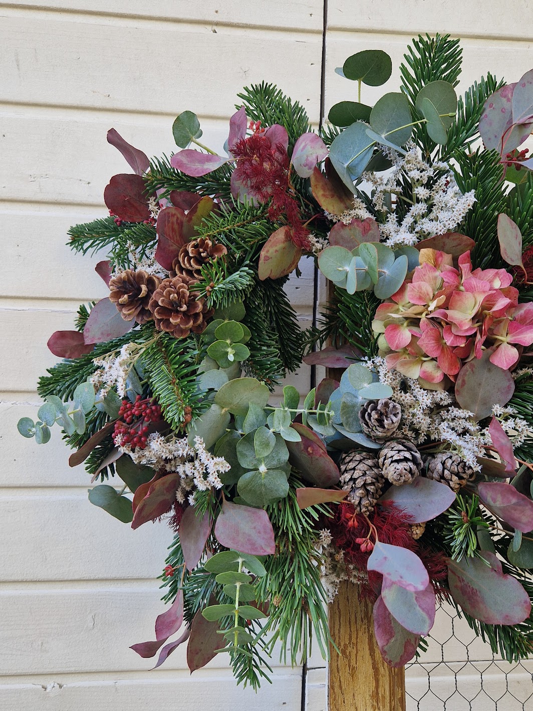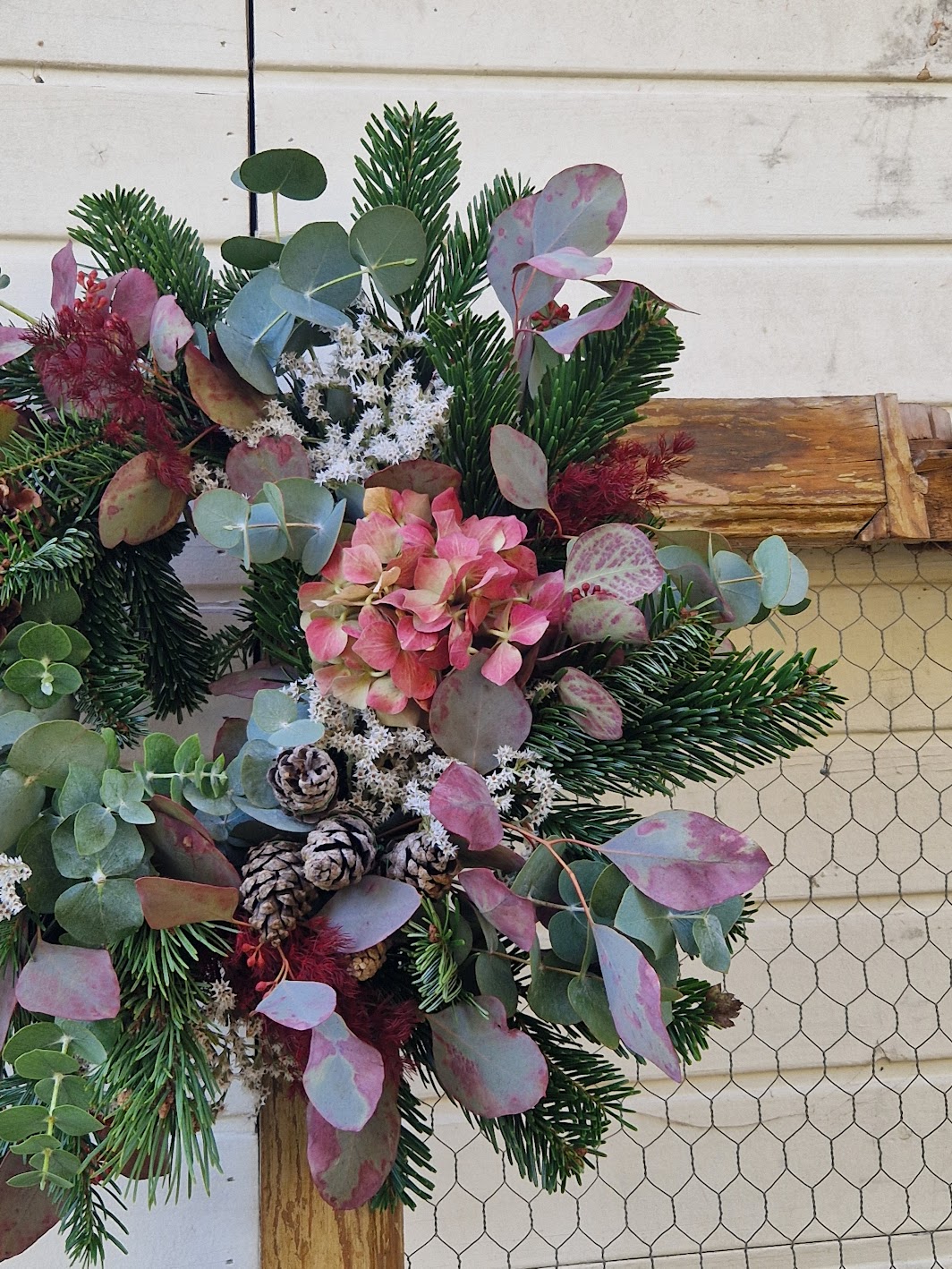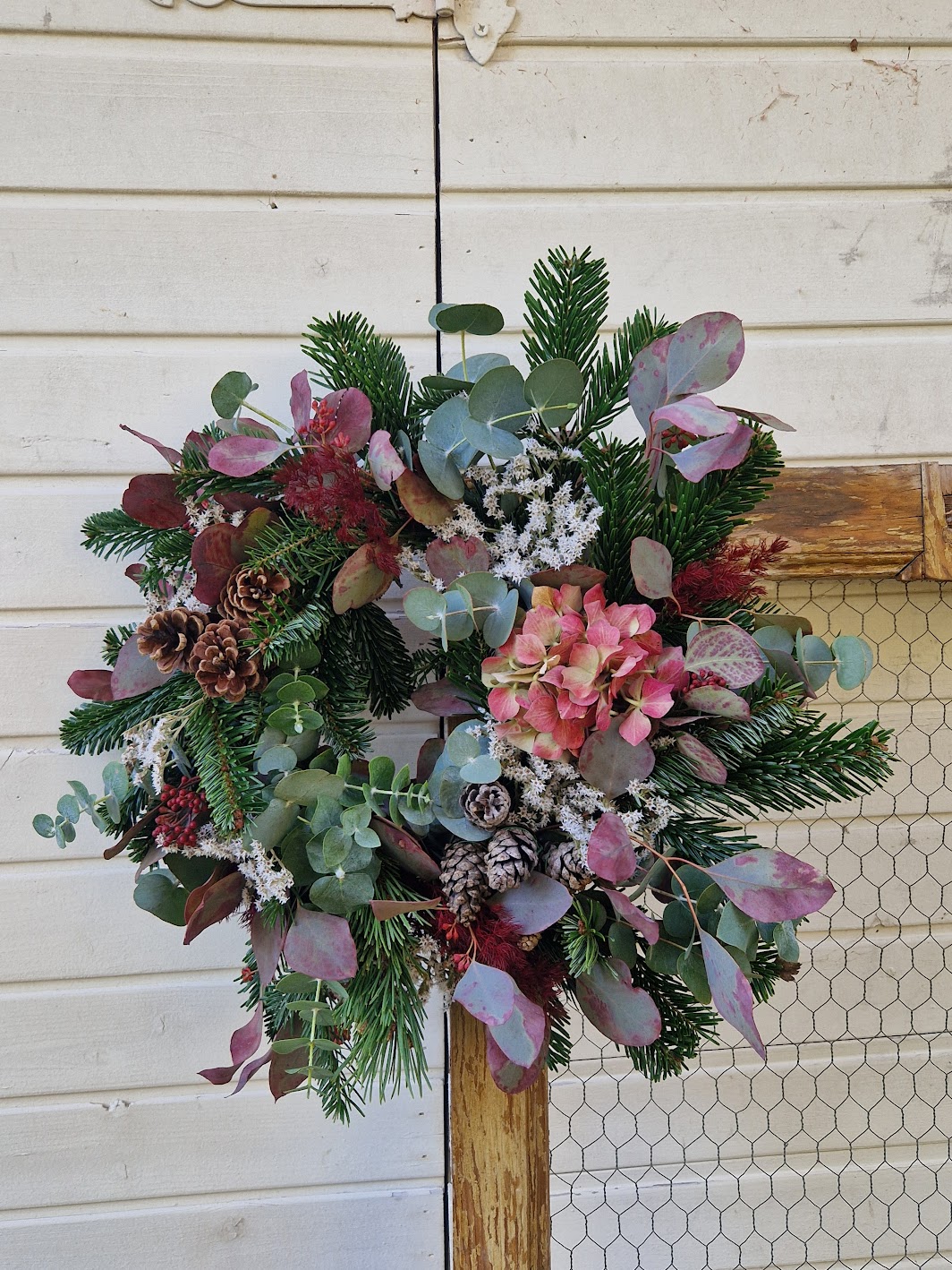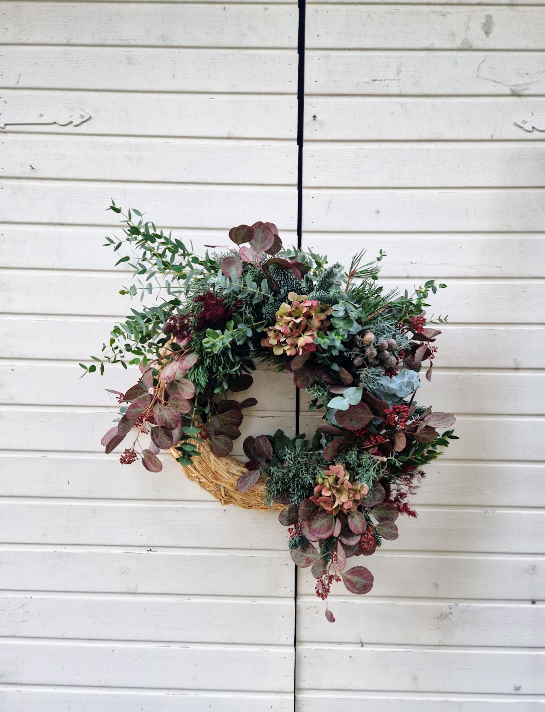 - Corona con base de heno y variedad de verdes naturales frescos.