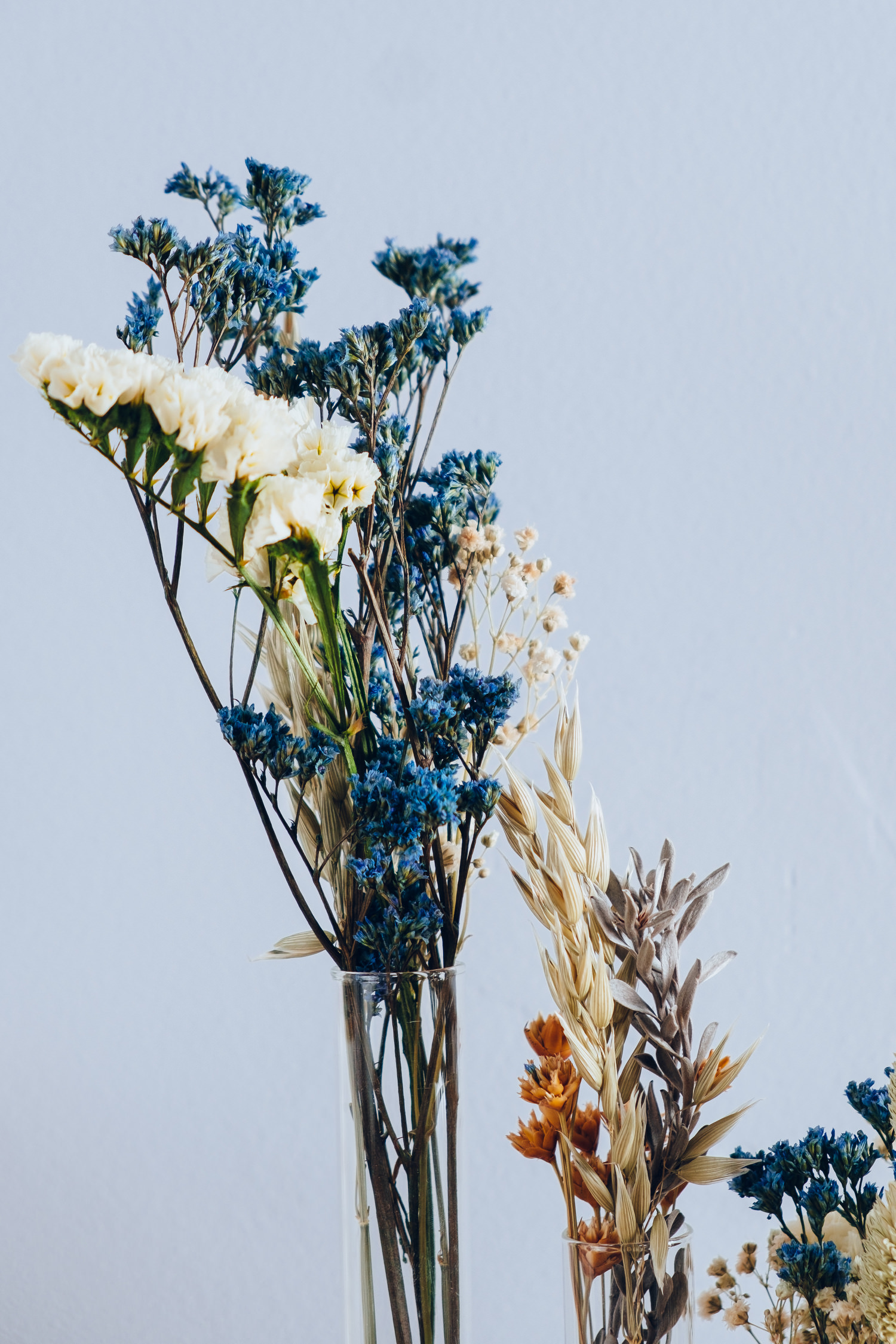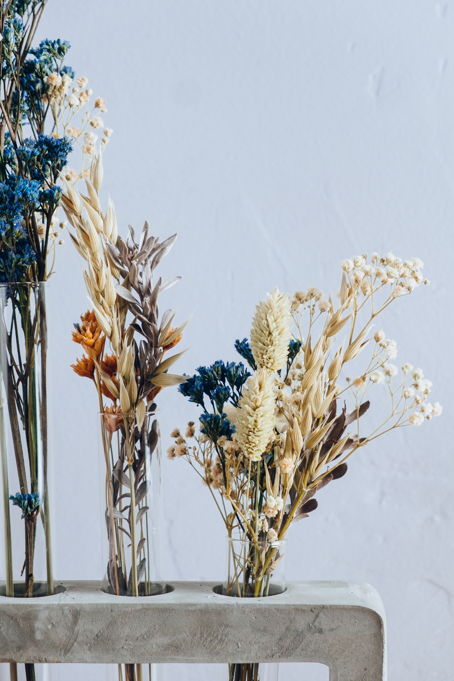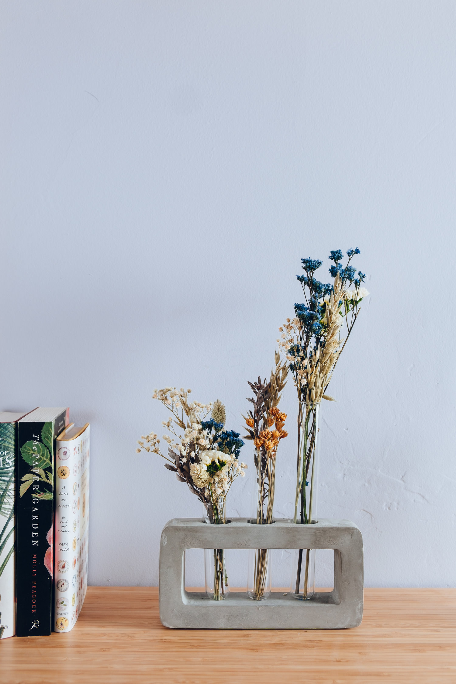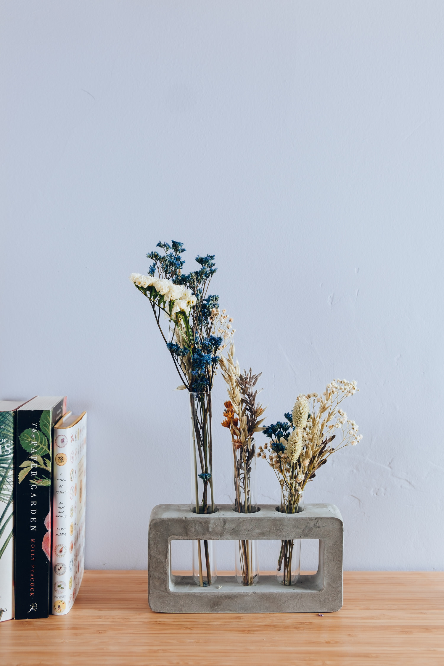 Jarrón de cemento con flores preservadas en probetas de cristal.