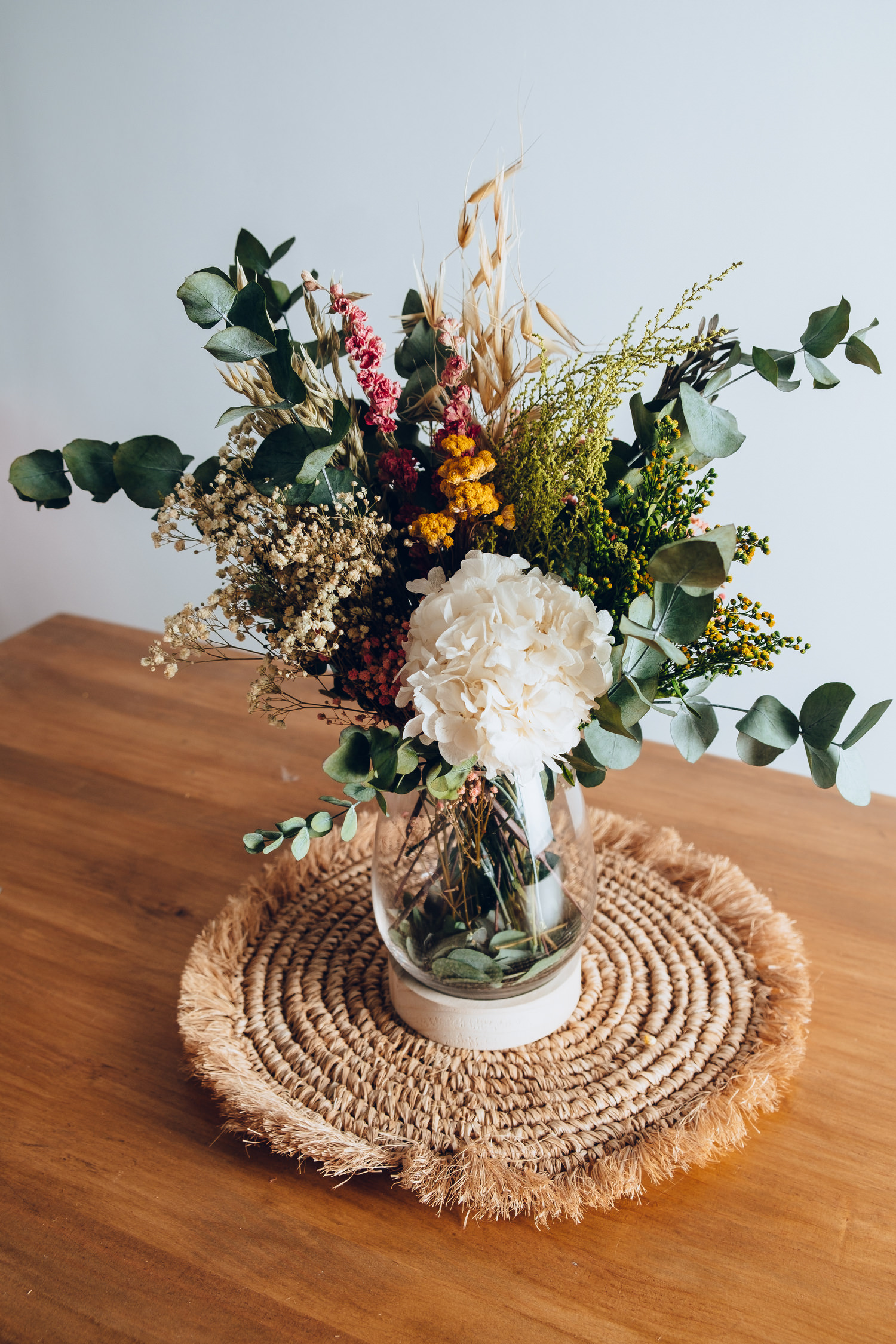 Las flores pueden sufrir modificaciones pero siempre se respetarán los tonos elegidos. Ten en cuenta que es difícil hacer un centro igual a otro y que además somos un taller creativo, no nos gusta hacer siempre el mismo centro.