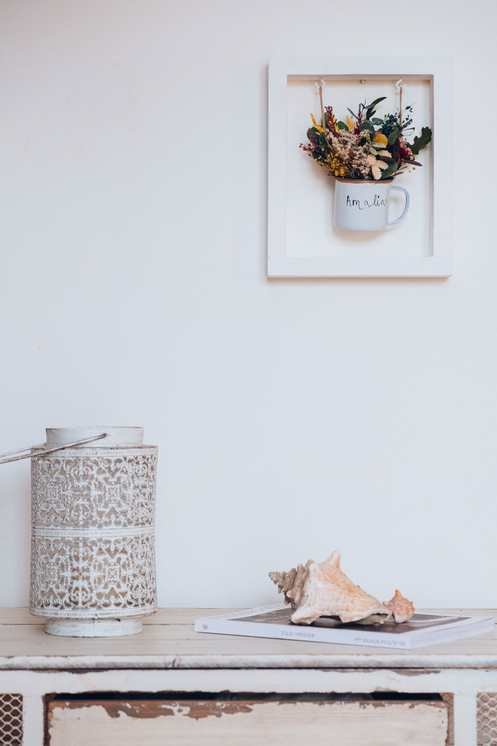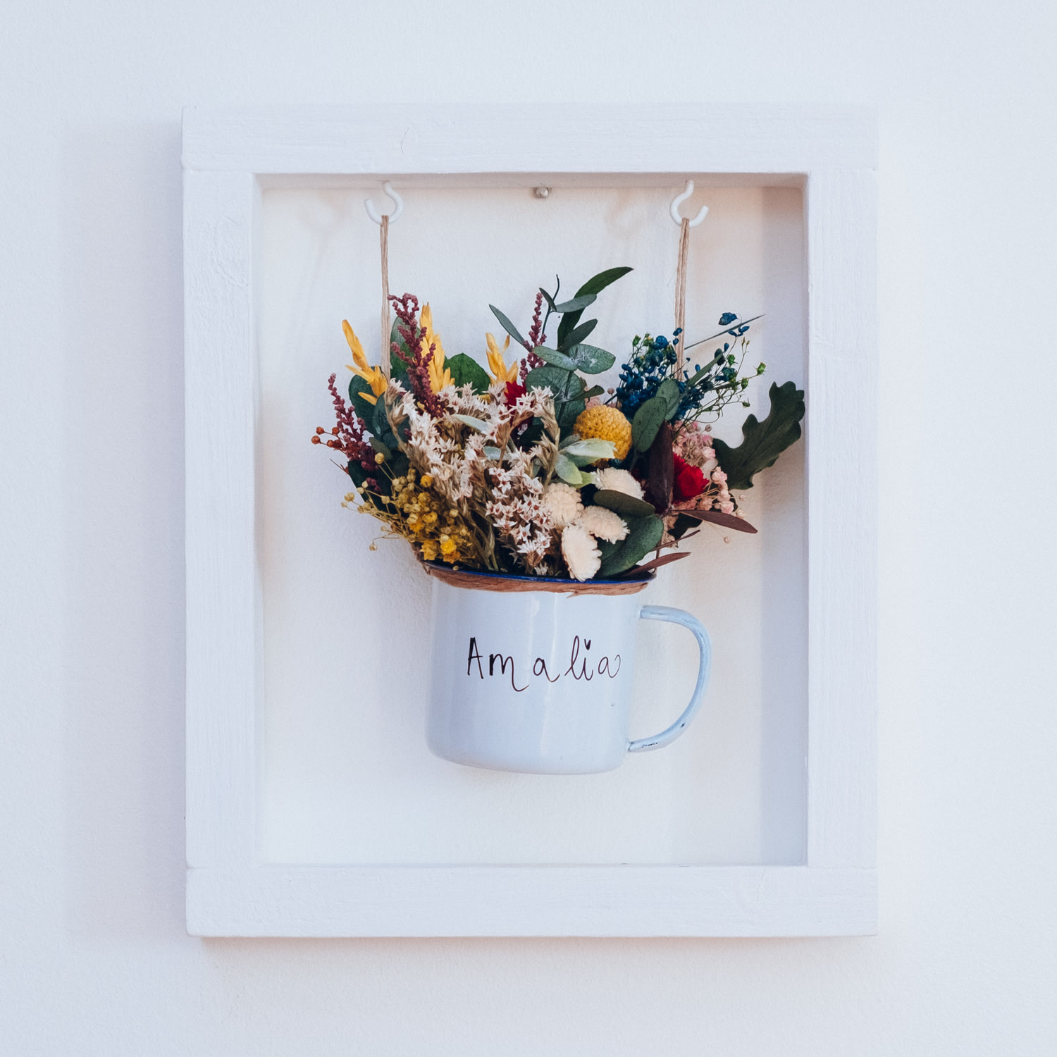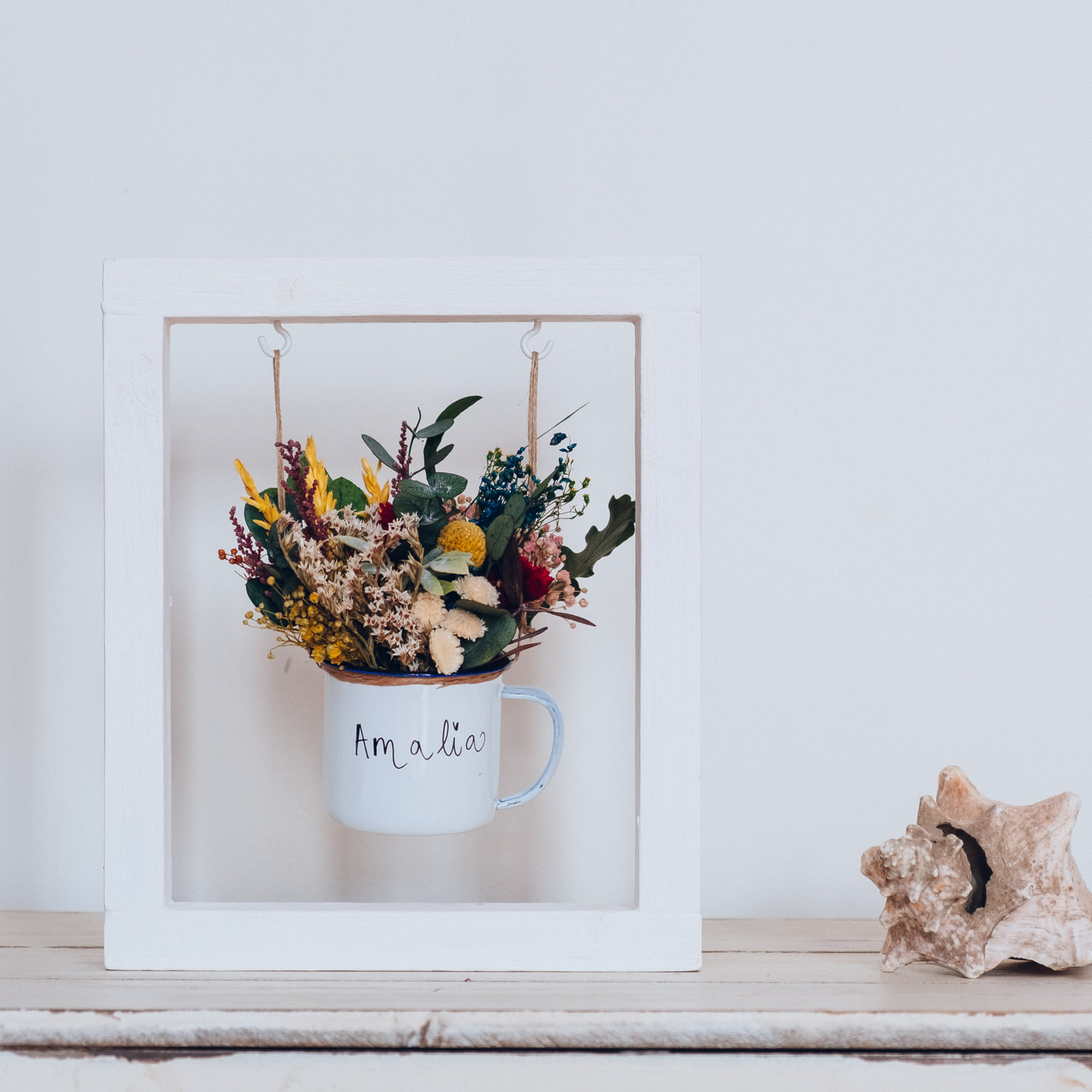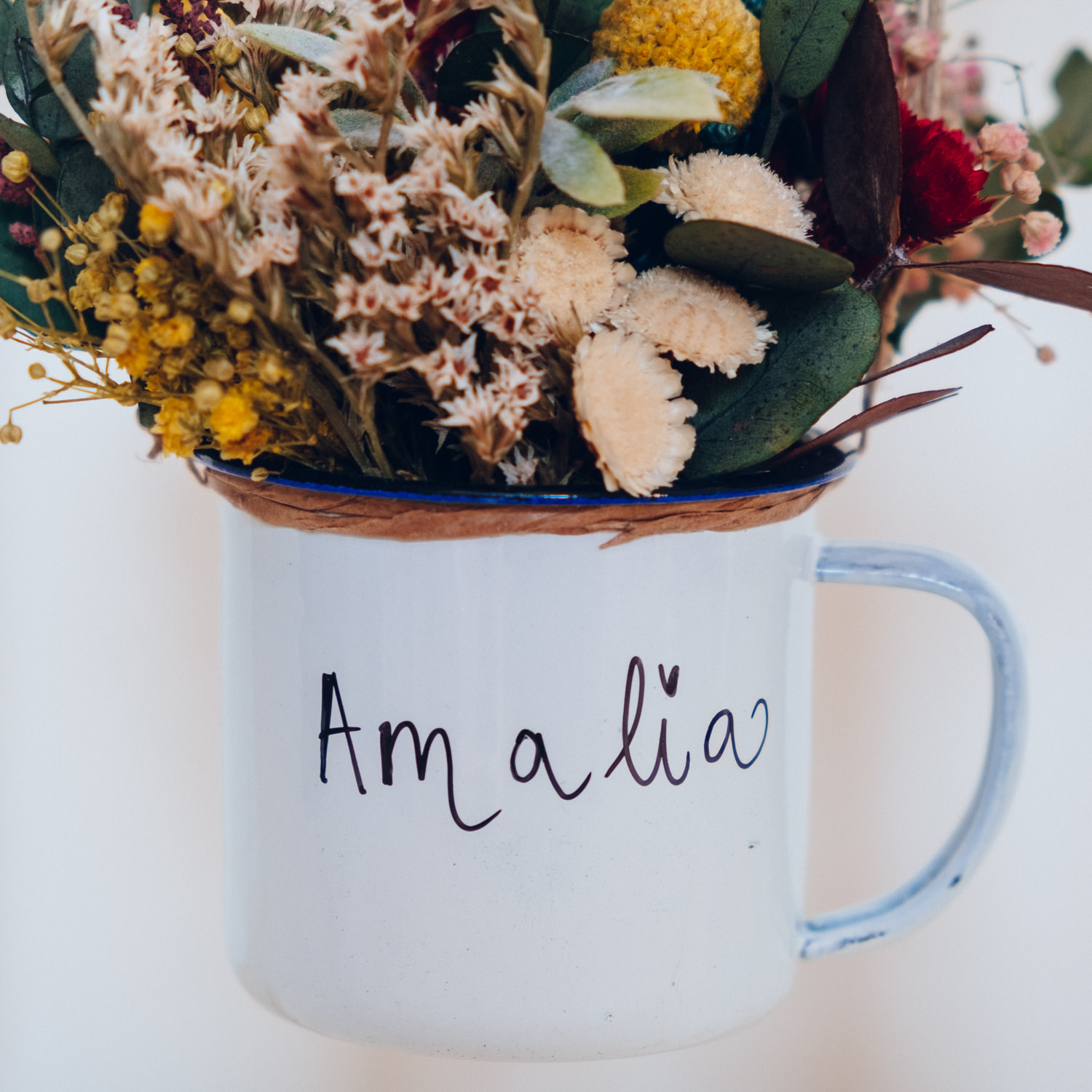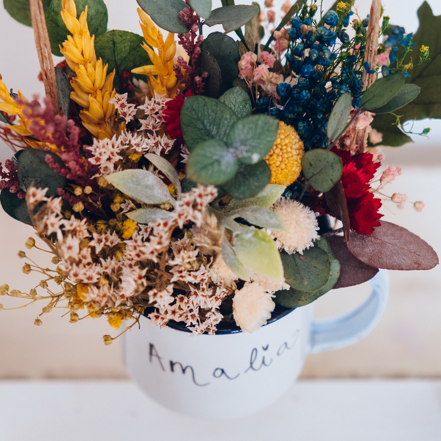 Centro de flores preservadas en una tacita que puedes personalizar con la frase o el nombre que quieras. Sólo tienes que indicarlo, cuando hagas el pago, en la casilla de observaciones y nosotras nos encargaremos de que quede bonito.