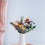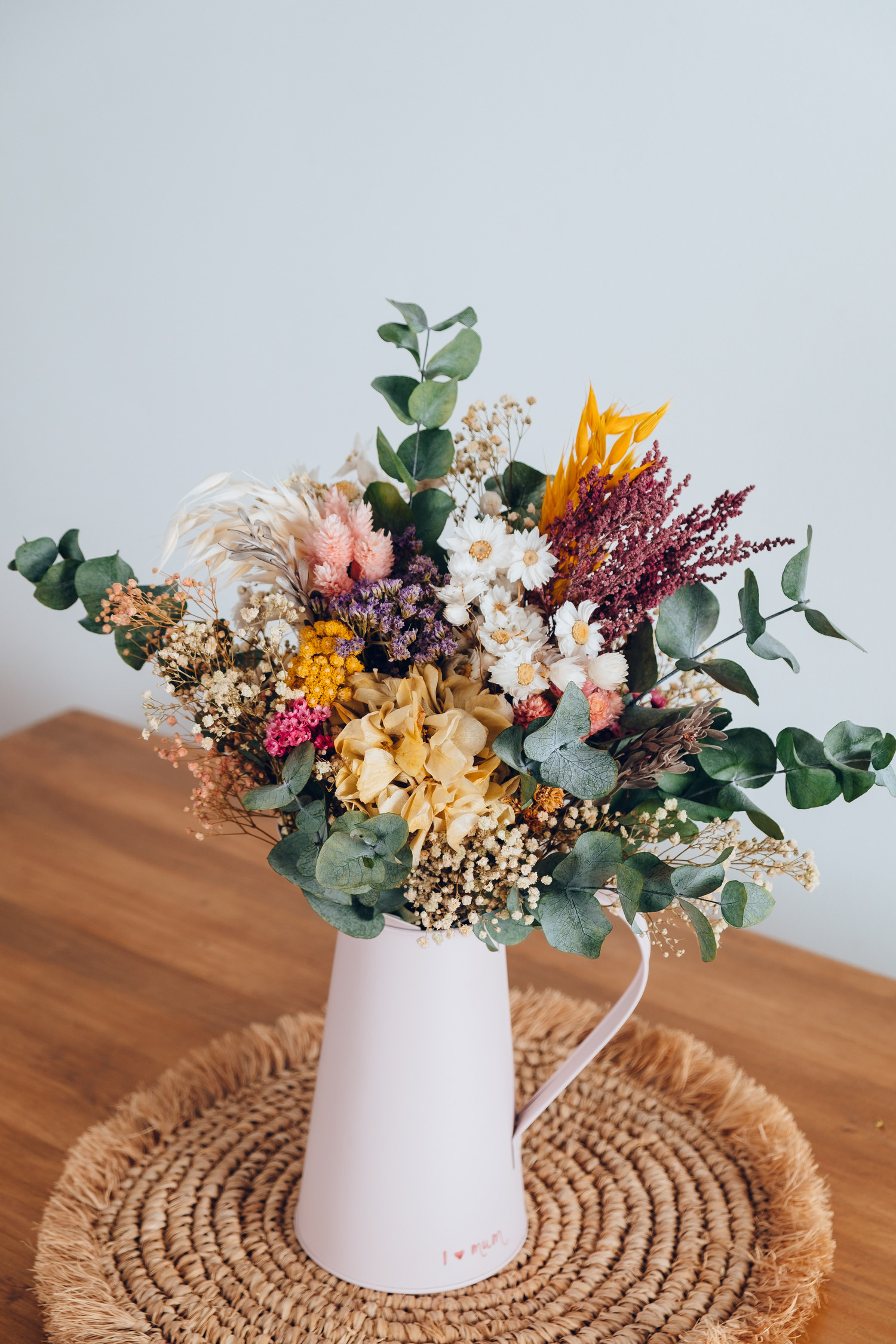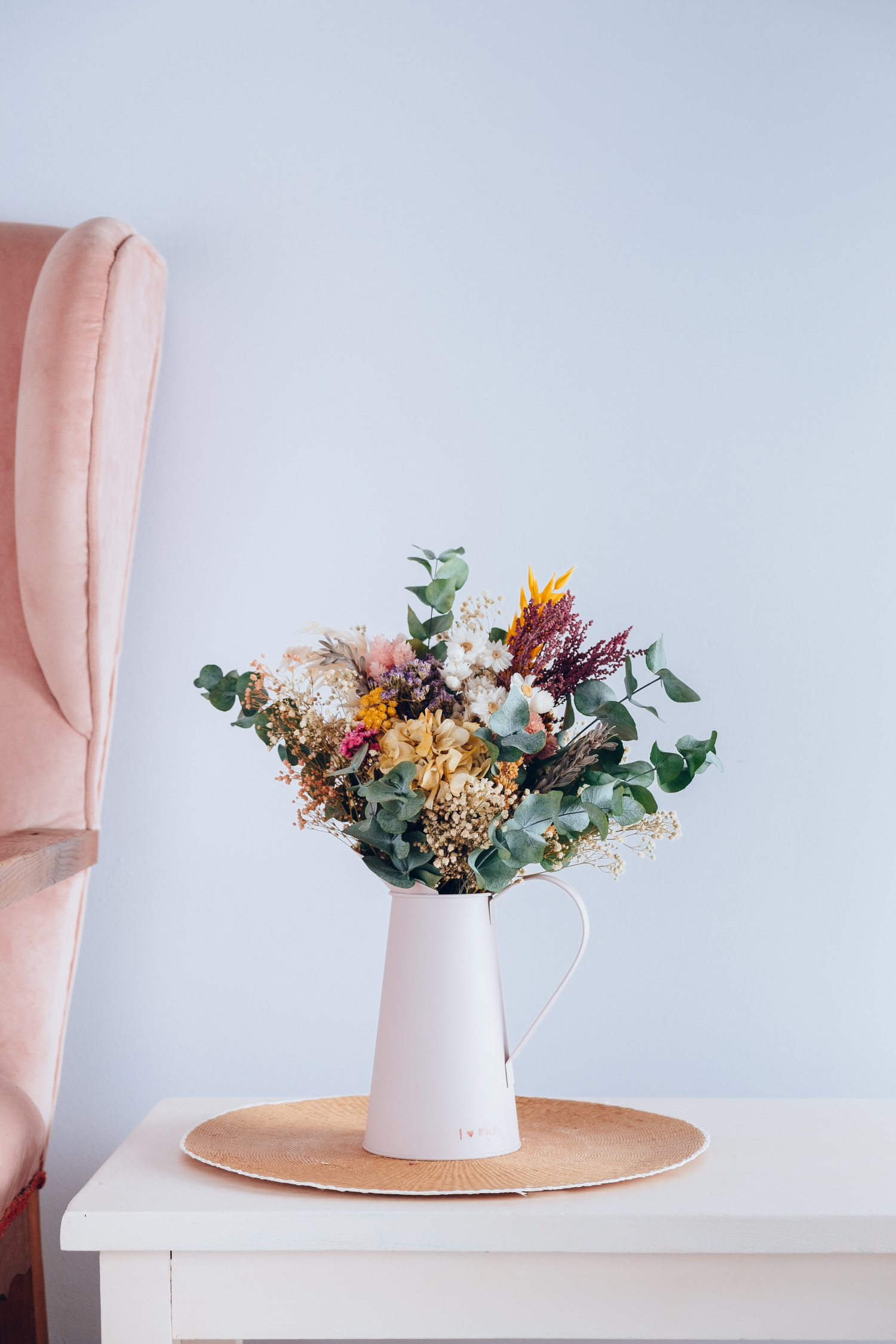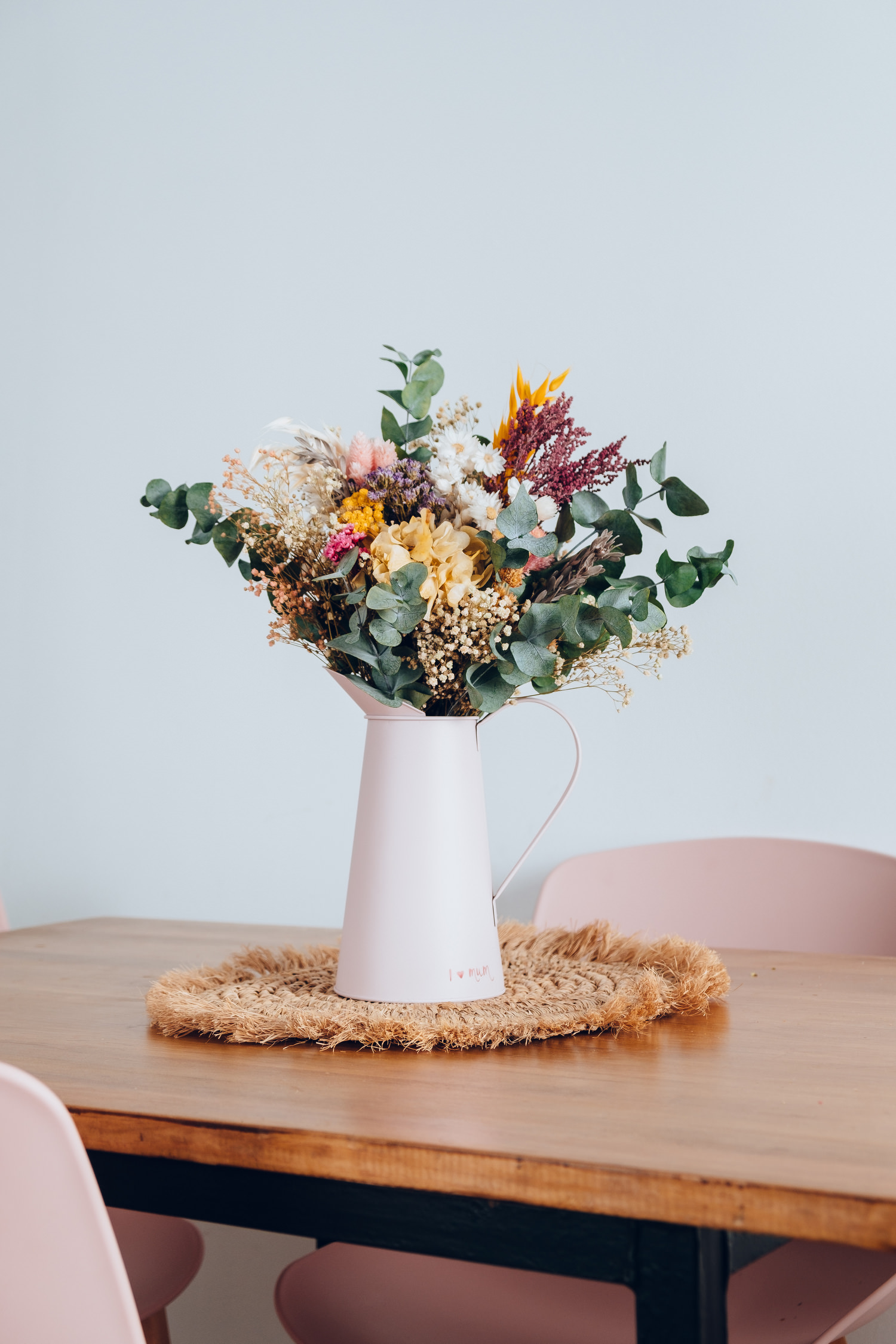 Jarra rústica de metal pintada a mano en tono rosa palo y gris muy suave. Tiene una mezcla de eucalipto con flores silvestres y hortensia.