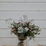 Centro de flores preservadas y secas en un jarrón de cristal incluido en el precio.
