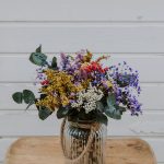 Centro de flores preservadas y secas en un jarrón de cristal incluido en el precio.