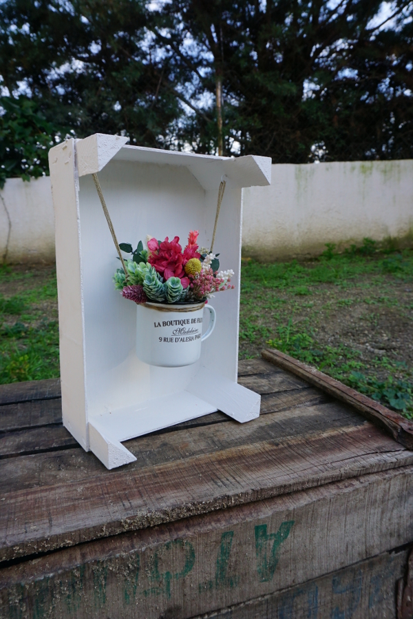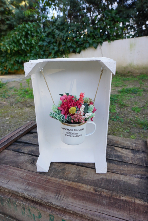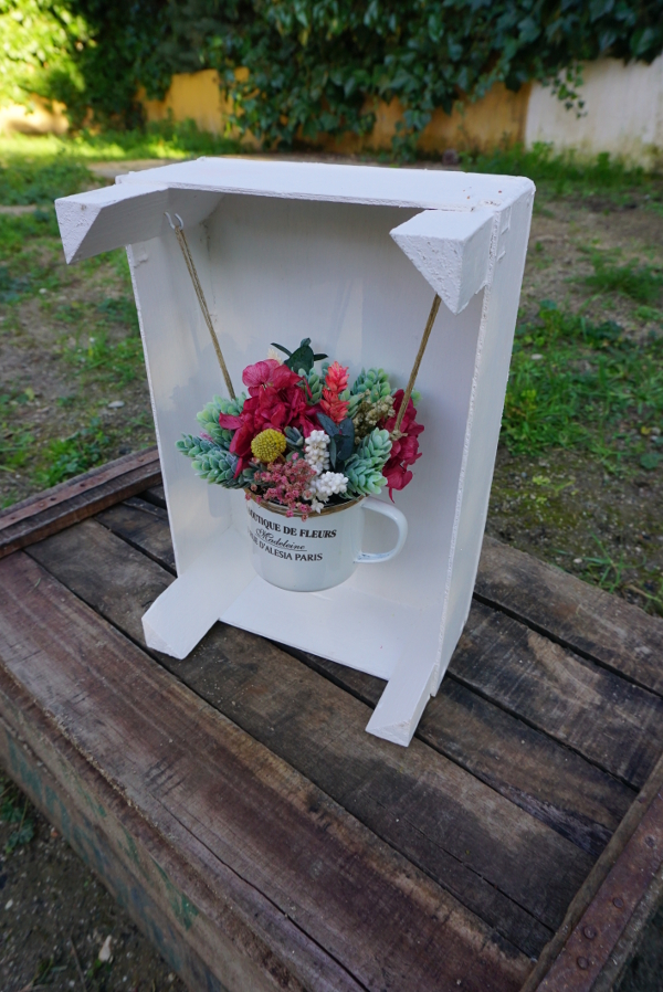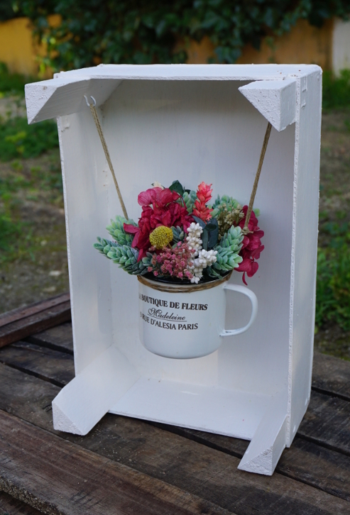 Flores secas, preservadas y artificiales (sólo las piñas verdes) en una taza que cuelga de una caja de frutas reciclada.