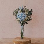 • El ramo está compuesto por una hortensia azul, eucalipto y variedad de flores silvestres.
