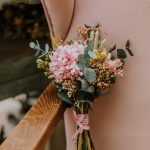 • El ramo está compuesto por una hortensia rosa, eucalipto y variedad de flores silvestres.