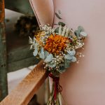 • El ramo está compuesto por una hortensia naranja, eucalipto y variedad de flores silvestres.
