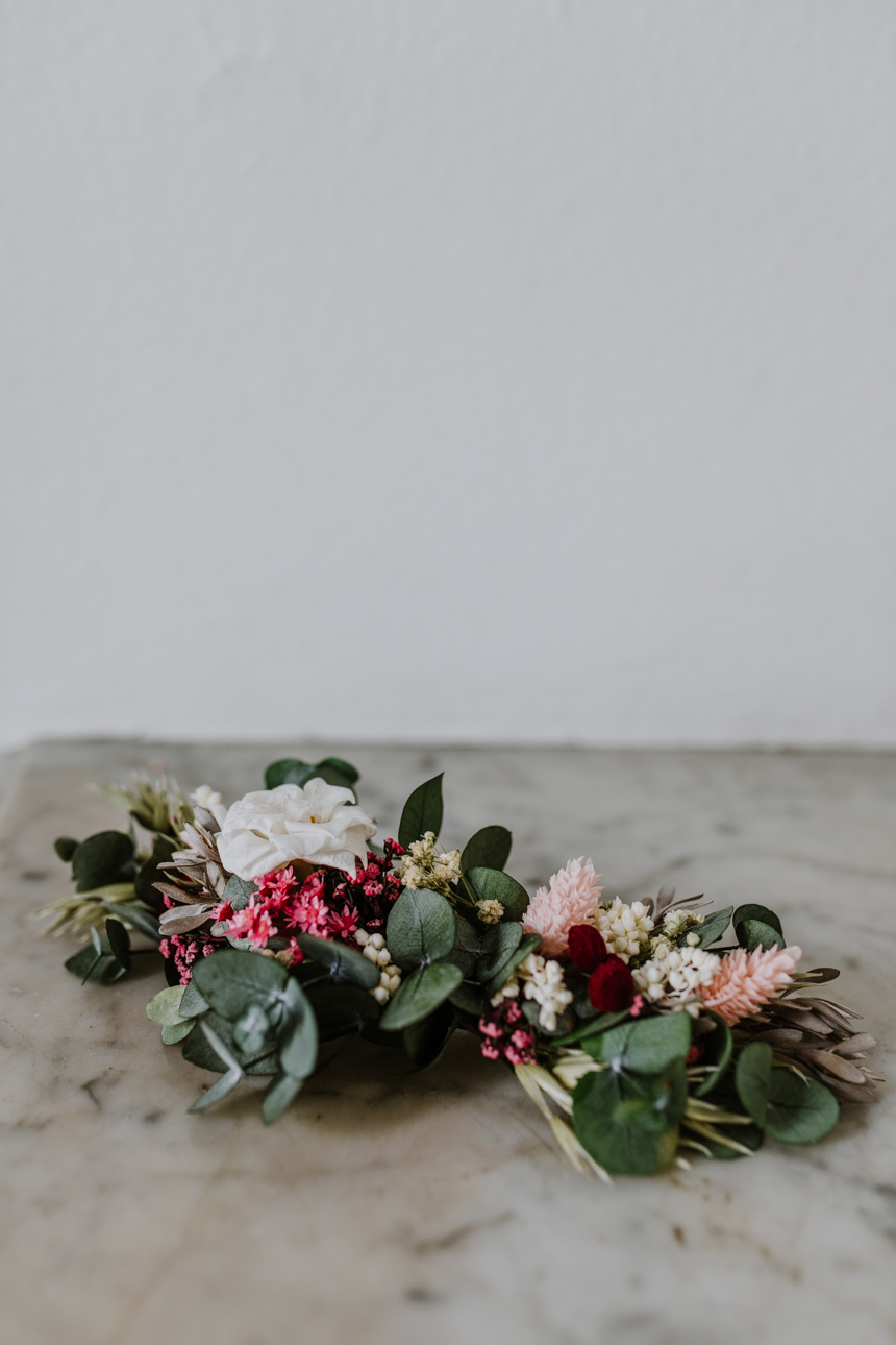 Corona de flores silvestre con una base de eucalipto, flores pequeñitas y dos detalles de hortensias. Es abierta, se cierra con un lazo de encaje pero si la prefieres cerrada indícalo en observaciones cuando hagas el pedido.